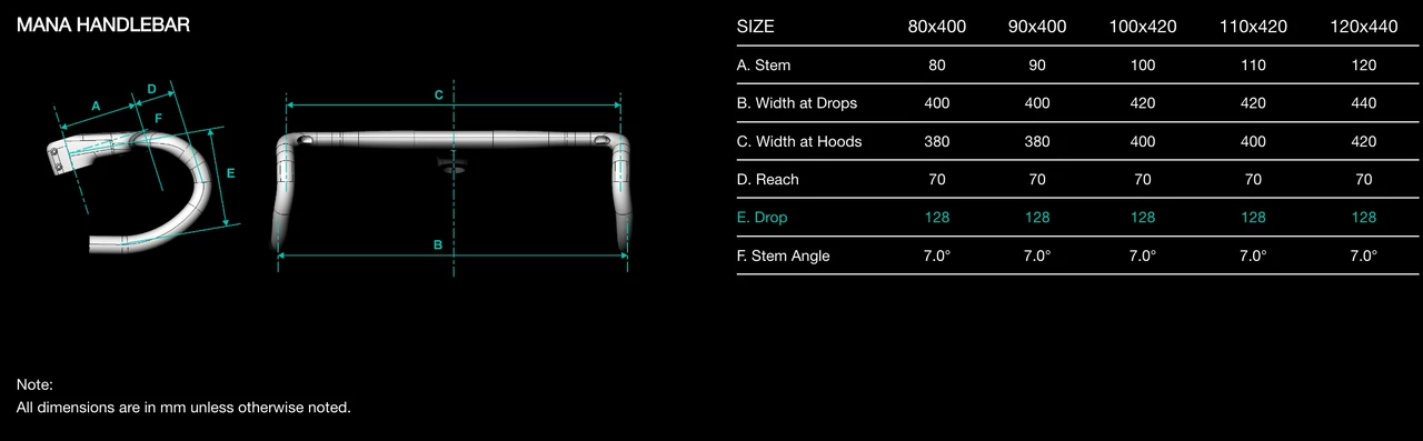 - Handlebar/Stem (MANA): 395g (100-420mm) +/- 3%