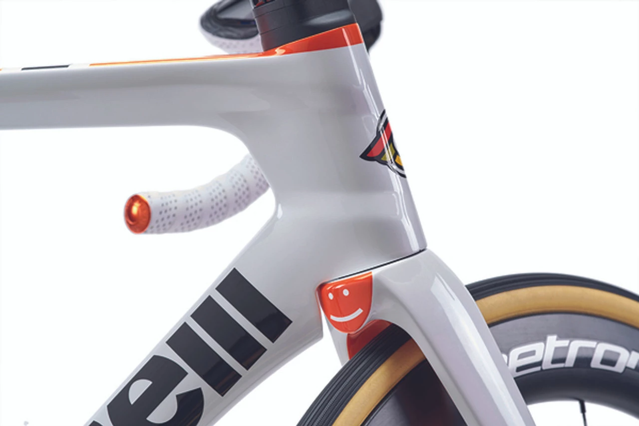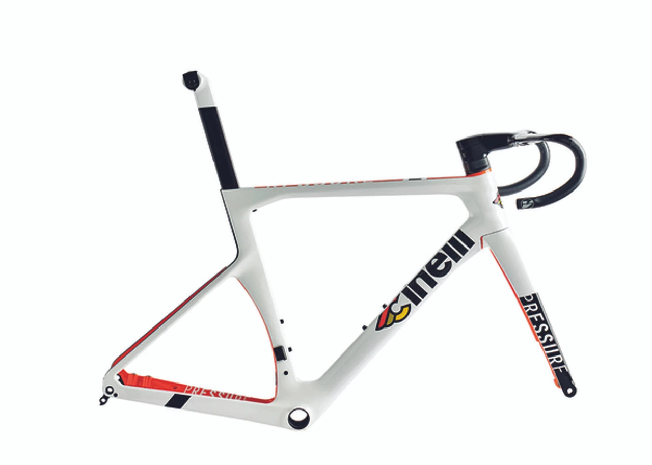 The newborn Cinelli aerodynamic racing frame integrates anything possible: the special aero seat tube, the custom color FSA Vision Metron 5D ACR fully integrated aero handlebar, with integrated headset, cockpit, and fork, for the cleanest cable routing solution and fastest racing geometry ever.