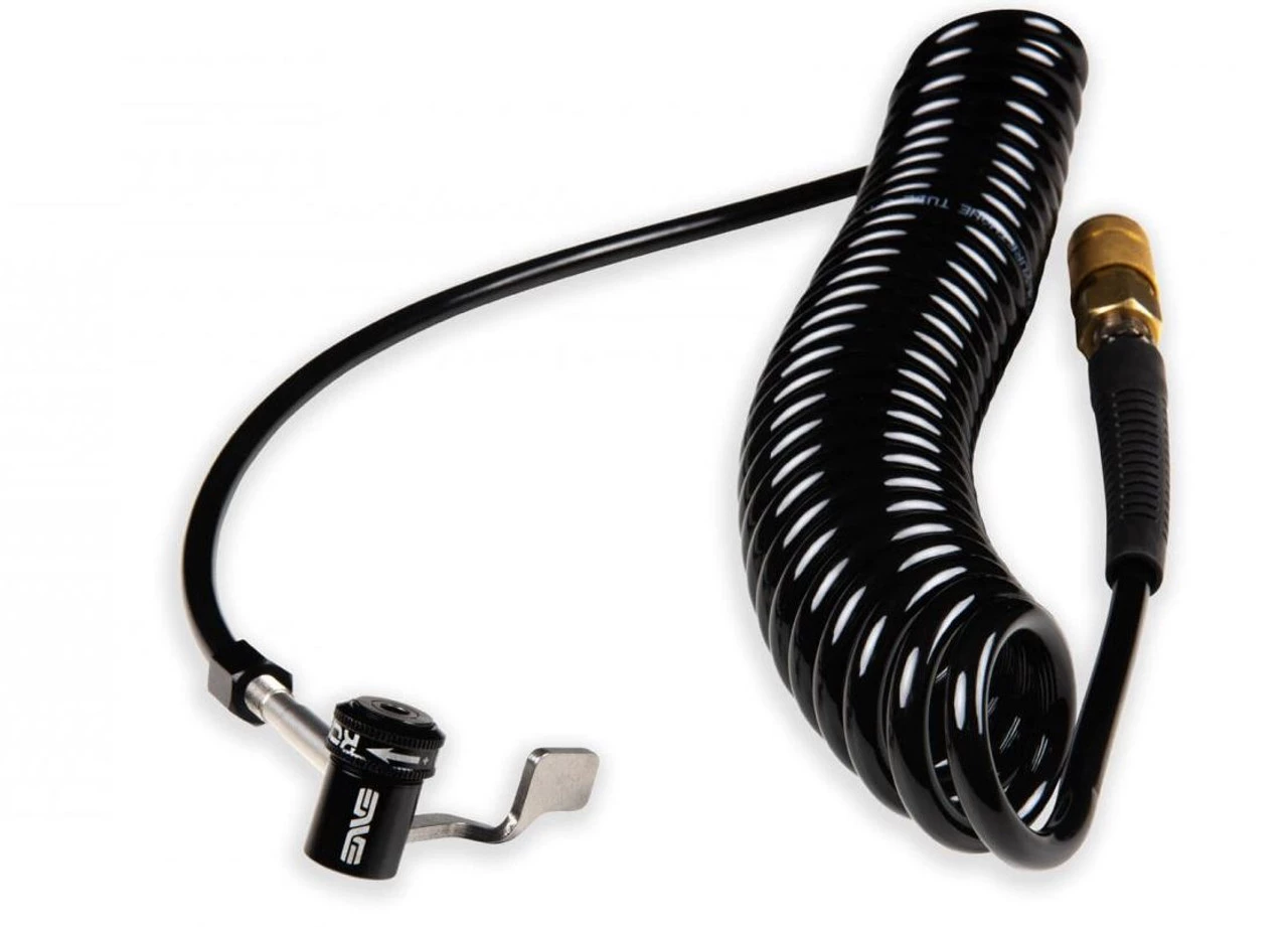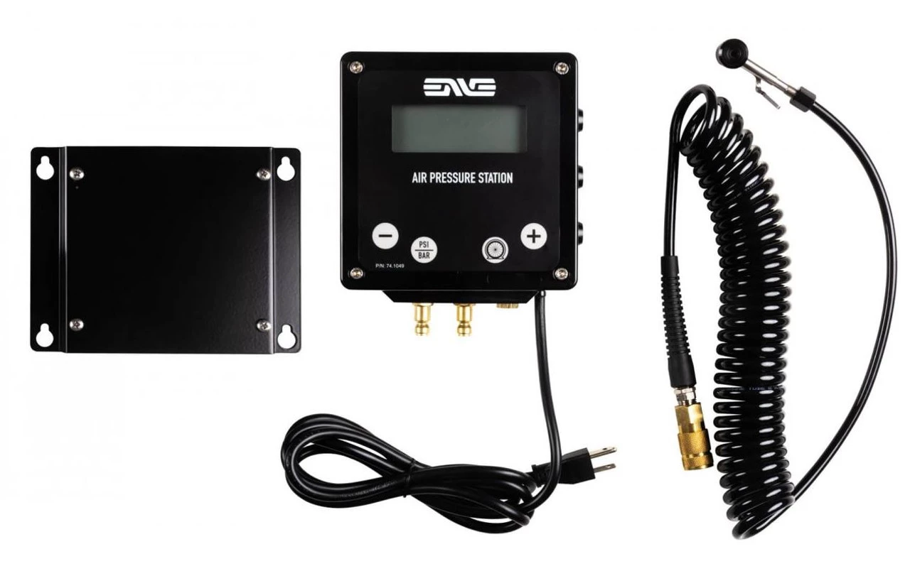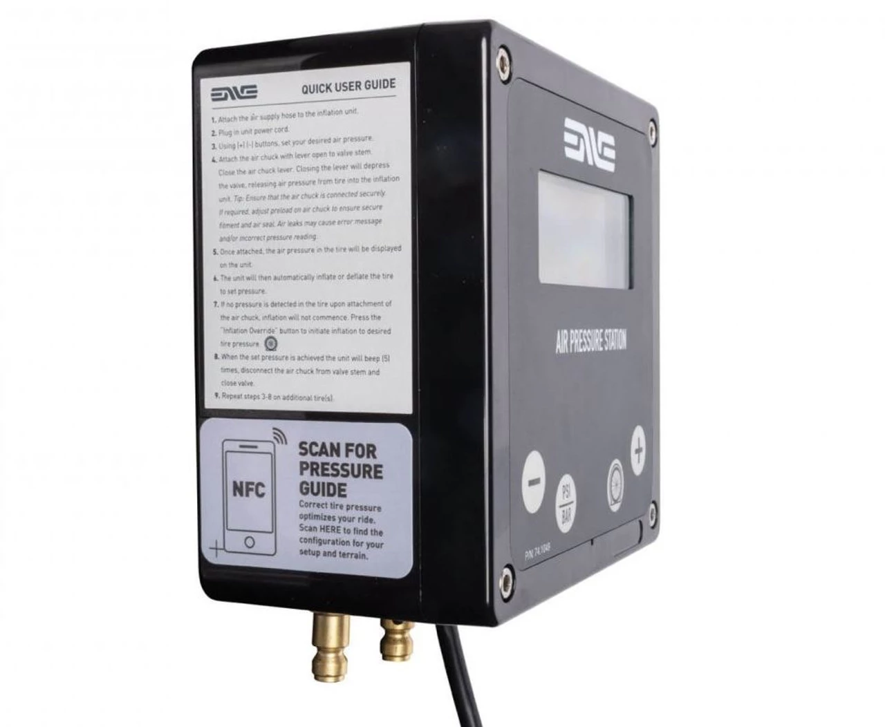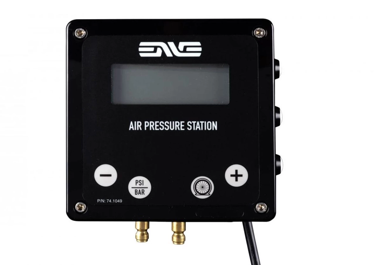 The ENVE Air Pressure Station is an automatic digital inflator that helps to seat, and accurately inflate any tire to within a .5% of a psi or bar. The Air Pressure Station connects to your existing air compressor, or bottled air and mounts cleanly on any wall or surface for an instant upgrade to your garage, service shop, van, or trailer. The unit features a digital interface, three tire pressure presets, tubeless tire/flat tire override function for safe and efficient tubeless tire seating, and a mobile device scannable NFC tag that directs the user to ENVE’s latest tire pressure recommendation charts. Unit includes a 15 foot coiled air hose, fittings, and custom ENVE adjustable presta valve air chuck.