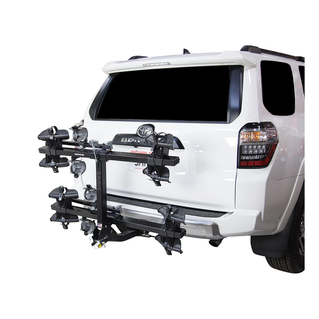 The Saris Freedom 4 tray-style hitch bike rack can carry just about any style of bicycle out there. Comes with a convenient foot-operated tilt pedal for car access.