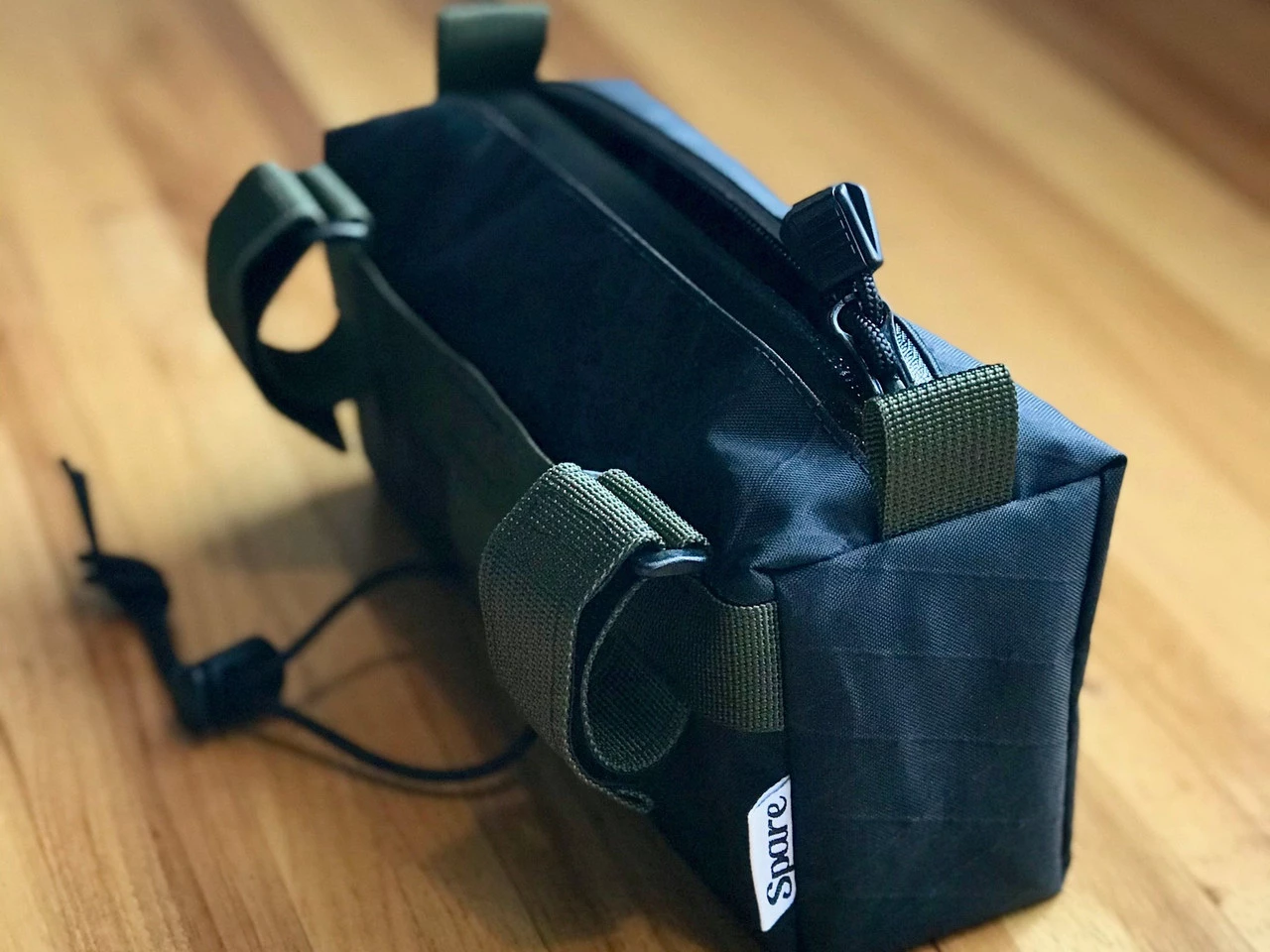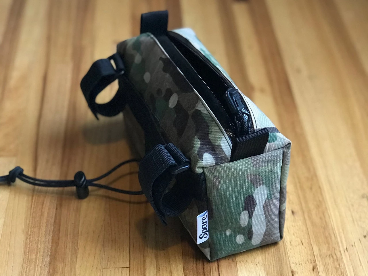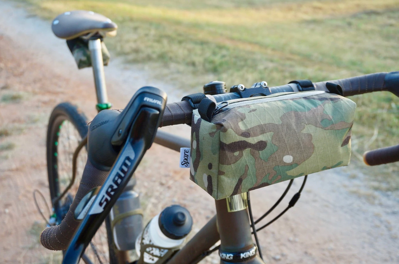 The Spare Bar Bag is compact on the bars, roomy for the extra snacks. The Bar Bag features a box shape design to allow for easy organization. Fully lined and built with X-Pac fabric and a YKK waterproof zip for durability and protection from the elements. Velcro attachment at bars + shock cord for stabilizing at the head-tube or headset. Pack more, go further.