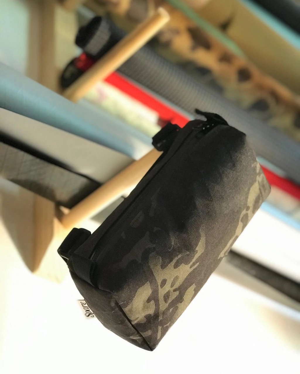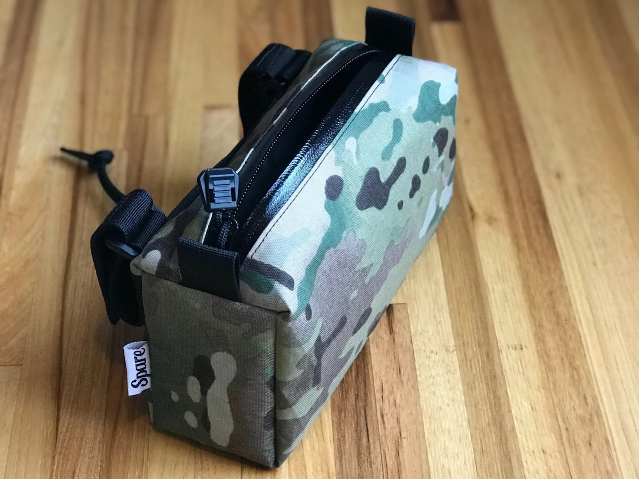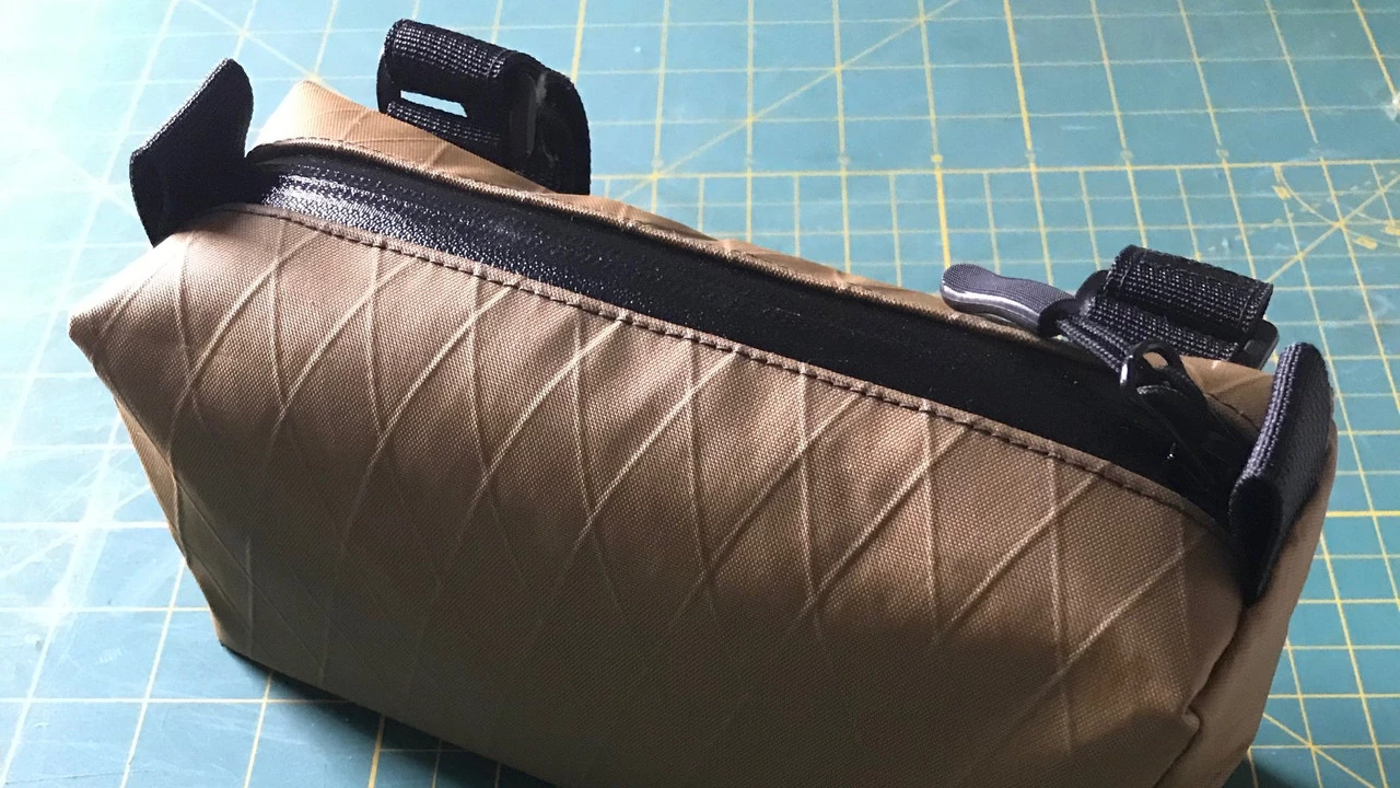 The Spare Bar Bag is compact on the bars, roomy for the extra snacks. The Bar Bag features a box shape design to allow for easy organization. Fully lined and built with X-Pac fabric and a YKK waterproof zip for durability and protection from the elements. Velcro attachment at bars + shock cord for stabilizing at the head-tube or headset. Pack more, go further.
